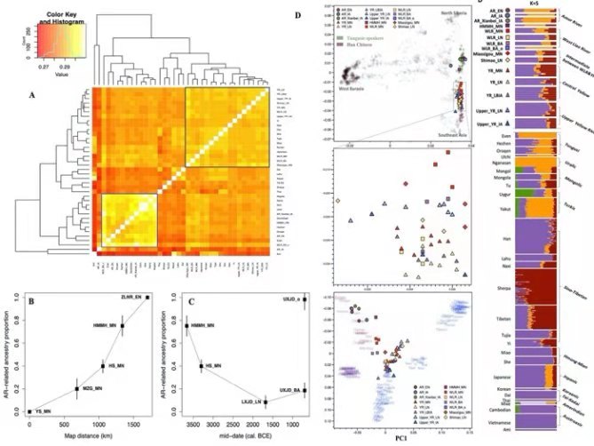 图1.左图为样本分布及年代区间。右图为中国北方古代人群遗传结构。其中(A)不同人群间共享等位基因差异,黄色表示人群间更高的遗传相似度。(B)黑龙江流域人群遗传成分在北方各古代人群中所占的比例随距离以及(C)时间的变化趋势。(D)人群聚类分析,基因结构相近的人群更加相似。
