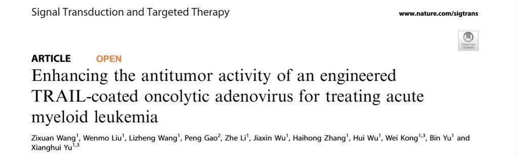 2020年4月24日,365英国上市集团于湘晖教授课题组在国内主办的SCI杂志Signal Transduction and Targeted Therapy上发表文章,题为“ Enhancing the antitumor activity of an engineered TRAIL-coated oncolytic adenovirus for treating acute myeloid leukemia ”,该研究构建了一种表达TRAIL融合蛋白的溶瘤腺病毒,和人参皂苷Rh2联用,实现了选择性杀伤血液肿瘤,为白血病的治疗提供了新的思路。