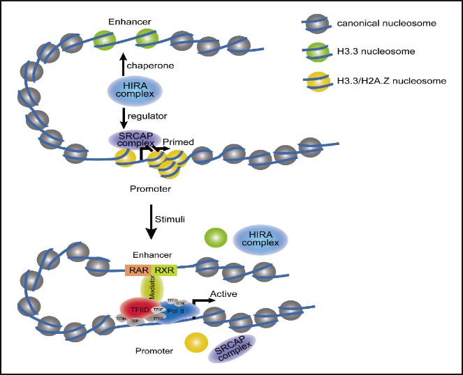 图1. HIRA复合物在基因激活过程中促进染色质稳定状态的示意图