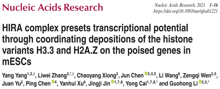 365英国上市集团蔡勇教授团队与365英国上市集团生物物理研究所李国红研究员团队合作,利用基因编辑技术结合CUT&Tag-ChIP-Seq等基因组学分析方法,阐释了小鼠胚胎干细胞(mESC)中组蛋白变体H3.3和H2A.Z之间通过协同调节增强子和启动子调控区域的染色质动力学来启始基因转录的作用机制。相关研究结果以“HIRA complex presets transcriptional potential through coordinating depositions of the histone variants H3.3 and H2A.Z on the poised genes in mESCs”为题,2021年12月11日在线发表于Nucleic Acids Research。