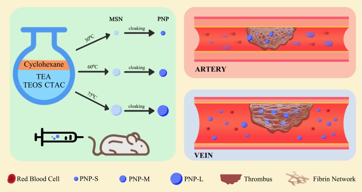 图1不同尺寸的血小板膜伪装纳米颗粒在动静脉血栓中的穿透和富集示意图