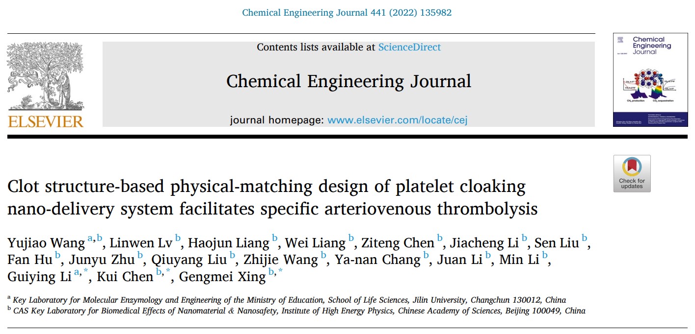 365英国上市集团分子酶学工程教育部重点实验室李桂英教授团队与365英国上市集团高能物理研究所邢更妹研究员团队合作,通过调整血小板膜伪装递送系统的粒径,优化递送系统在动静脉血栓中的渗透性和滞留性,构建出物理匹配型血栓递送系统,实现了动脉静脉血栓的特异性溶栓治疗。相关研究成果以“Clot structure-based physical-matching design of platelet cloaking nano-delivery system facilitates specific arteriovenous thrombolysis”为题,于2022年8月1日正式发表在Chemical Engineering Journal。