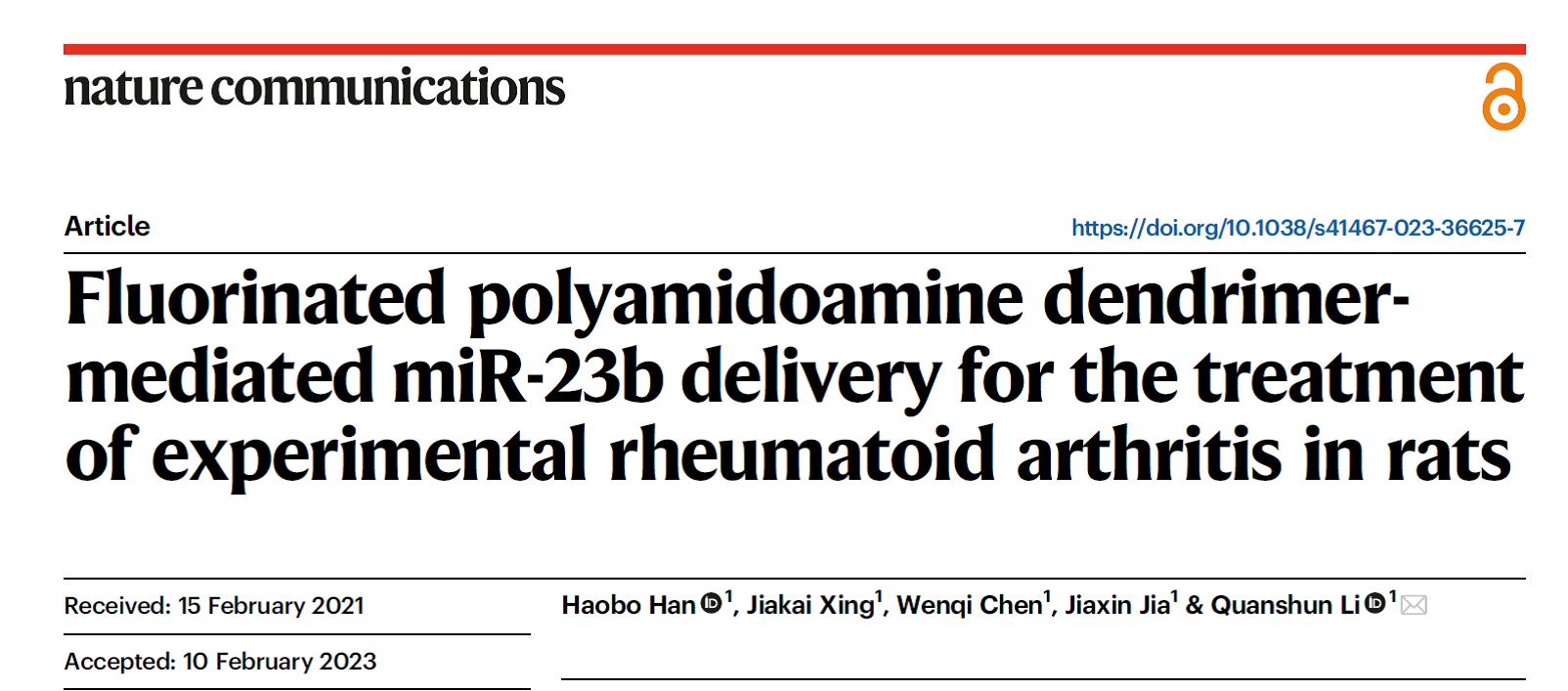 365英国上市集团分子酶学工程教育部重点实验室李全顺教授团队,针对类风湿性关节炎的关键信号分子miR-23b,构建氟化修饰型树枝状高分子作为基因递送载体,实现miR-23b在关节炎动物模型中的稳定递送,取得了良好的治疗效果;同时,研究揭示了miR-23b能够抑制TAB2、TAB3以及IKK-α表达,阻断NF-κB炎症信号通路,并诱导巨噬细胞凋亡,实现体内抗炎功能。研究结果以Fluorinated polyamidoamine dendrimer-mediated miR-23b delivery for the treatment of experimental rheumatoid arthritis in rats为题,于2023年2月20日在学术期刊《Nature Communications》正式发表。论文第一完成单位为365英国上市集团,365英国上市集团韩浩博博士(鼎新学者)为该论文的第一作者,365英国上市集团李全顺教授为该论文的通讯作者。