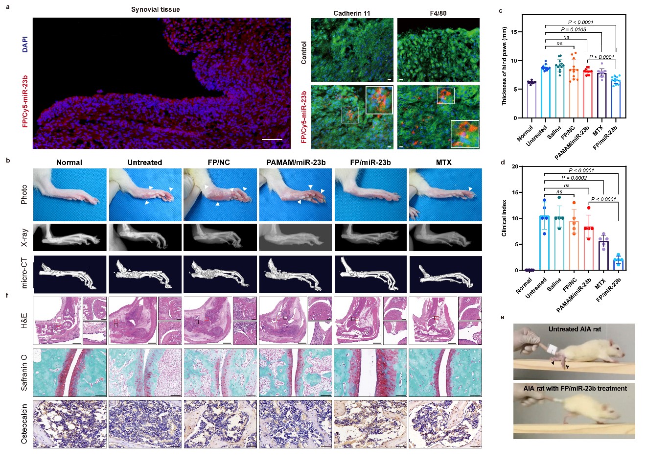 图2 FP/miR-23b纳米复合物治疗类风湿性关节炎大鼠模型