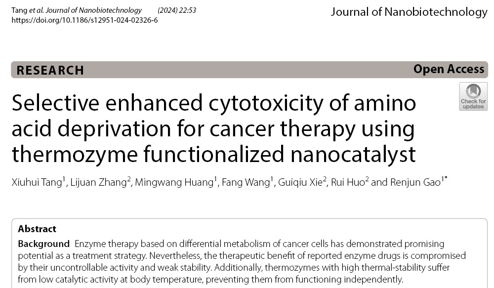 酶法治疗是很有潜力的癌症治疗策略,已报道的常温酶药物由于活性不可控、短半衰期等问题而使其治疗效果大打折扣。本课题组创造了一种新型的嗜热酶疗策略,用于乳腺癌的精准催化治疗:将嗜热精氨酸酶和天冬氨酸酶与纳米金和透明质酸偶联为纳米催化剂,靶向癌细胞后,用红外激光特异性激活嗜热酶消耗癌细胞内的氨基酸,诱发细胞凋亡,并协同光热治疗,有效杀伤了癌细胞。该疗法副作用小,范围可控,是一种有潜力的抗癌策略,相关结果发表在Journal of Nanobiotechnology,论文第一完成单位为365英国上市集团,365英国上市集团博士汤秀慧为该论文的第一作者,365英国上市集团高仁钧教授为该论文的通讯作者。