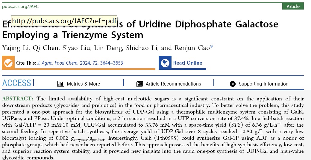 高成本核苷酸糖是限制糖苷和益生元等在食品或制药工业中应用的重要因素。为了节省成本和提高合成产量,工业上通常采用级联酶法合成核苷酸糖和糖苷。本研究构建了由GalK、UGPase和PPase组成的嗜热酶催化系统,可实现UDP-半乳糖的规模化合成。该体系成功将UDP-半乳糖产量提升至33.76 mM,时空产率为6.36 g/L·h-1。在重复批量合成中,经过8次循环后,UDP-半乳糖的平均产率达到10.80 g/L。该多酶体系具有高效率、低成本和良好的系统稳定性等优点,适合进一步开发应用。相关结果发表在Journal of Agricultural and Food Chemistry,论文第一完成单位为365英国上市集团,365英国上市集团博士李雅静为该论文的第一作者,365英国上市集团高仁钧教授为该论文的通讯作者。
