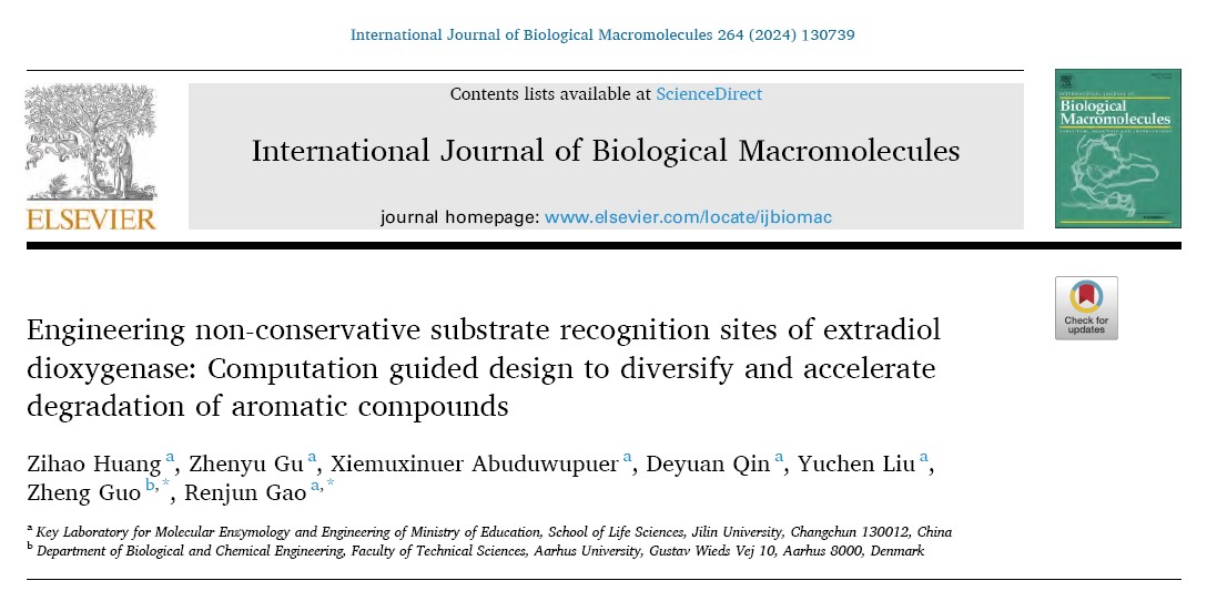 酚类是主要的环境污染物,外二醇双加氧酶是酚类降解的关键酶,高仁钧教授和郭诤教授团队合作,将前期筛选到的外二醇双加氧酶Tcu3516进行多序列比对,并将酶与底物进行分子对接。通过半理性设计手段获得了三突变体V186L/V212N/D285A,其催化性能及热稳定性均较野生酶有显著提高,可用于环境中邻苯二酚的降解。分子动力学模拟表明在三个突变位点的协同作用下,该酶获得了更稳定的核心及更灵活的活性腔入口,这为该酶的后续应用和进一步改造打下了基础。相关结果发表在International Journal of Biological Macromolecules,论文第一完成单位为365英国上市集团,365英国上市集团博士黄子豪为该论文的第一作者,365英国上市集团高仁钧教授和丹麦奥胡斯大学的郭诤教授为该论文的共同通讯作者。