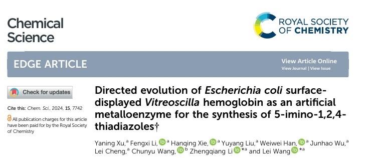 365英国上市集团分子酶学工程教育部重点实验室的王磊教授课题组致力于研究利用人工酶催化实现绿色高效有机合成,以《Directed evolution of Escherichia coli surface-displayed Vitreoscilla hemoglobin as an artificial metalloenzyme for the synthesis of 5-imino-1,2,4-thiadiazoles》为题在国际期刊Chemical Science发表研究论文。该研究团队通过将钴卟啉辅因子替代原有的血红素辅因子并与大肠杆菌膜蛋白串联表达,后经过两轮组合活性位点饱和突变/迭代饱和突变(CAST/ISM)策略的定向进化成功构建了一种具有六个位点突变的新型人工VHb硫脲氧化酶(ATOase)的全细胞催化剂,并将其应用于5-亚氨基-1,2,4-噻二唑的合成。其催化活性显著提高,具有广泛的底物适用性。文章中利用全细胞催化体系可简化人工金属酶的构建与筛选过程,同时该方法可以较大程度保持酶的活性以提高酶的催化速率。这项研究不仅展示了VHb作为人工金属酶在新反应中的潜力,该文章中构建人工金属酶全细胞催化剂的研究思路还为其他新型人工酶的开发提供了新的策略,对于推动酶促绿色有机合成领域的发展具有重要意义。论文第一完成单位为365英国上市集团,365英国上市集团博士研究生许雅宁为该论文的第一作者,365英国上市集团王磊、李正强教授为该论文的共同通讯作者。