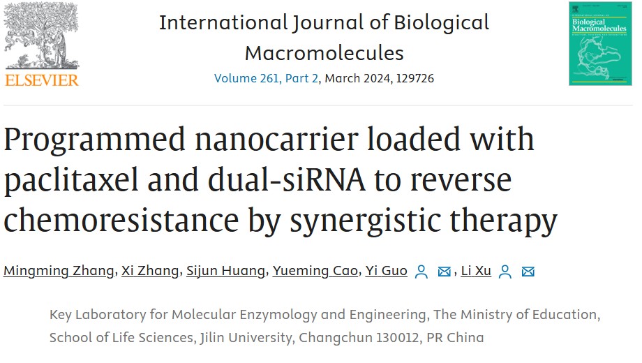 此外,在纳米药物载体方面,为增加PTX的水溶性以及缓解肿瘤耐药性,徐力郭轶教授团队以甲基丙烯酸羟丙酯(HPMA)作为亲水外壳,制备得到一种具有良好安全性和稳定性的阳离子共嵌段聚合物PPEMMRA,实现了多种耐药蛋白siRNA和PTX的共载和分步释放,在体内可以成功地将药物递送到肿瘤组织中。多种siRNA和PTX联用,可以抑制肿瘤细胞迁移,促进活性氧(ROS)释放,诱导肿瘤细胞凋亡,在耐药肿瘤细胞中具有强烈的抗肿瘤效果,进而逆转耐药性发生。研究论文“Programmed nanocarrier loaded with paclitaxel and dual-siRNA to reverse chemoresistance by synergistic therapy”发表在国际学术期刊《International Journal of Biological Macromolecules》上。论文第一完成单位为365英国上市集团,365英国上市集团张明明博士为该论文的第一作者,徐力教授、郭轶教授为该论文的共同通讯作者。