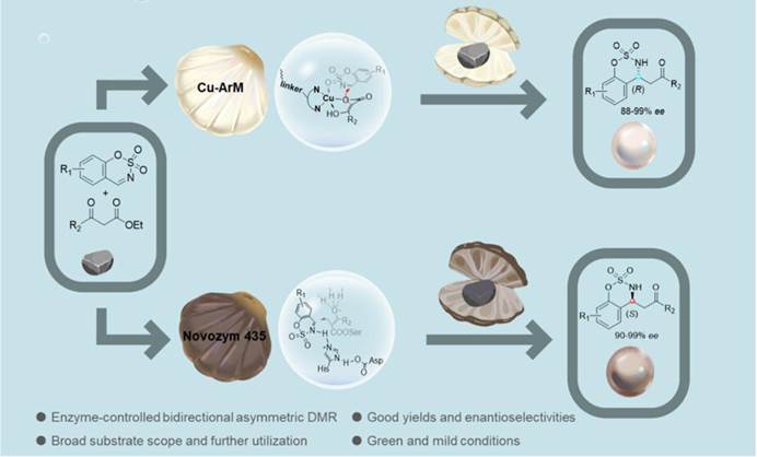该研究报道了一种酶控双向对映选择性催化策略,用于不对称脱羧曼尼希反应(DMR)合成手性β-磺酰胺酮。研究通过构建铜人工金属酶(Cu-ArM)和利用商业脂肪酶Novozym 435,分别实现对R和S构型产物的高选择性合成。Cu-ArM由生物素化铜复合物与链霉亲和素(WT-Sav)组装而成,催化环状磺酰胺与β-酮酯反应生成R构型产物;而Novozym 435通过其催化三元活性中心调控反应路径,高效获得S构型产物。分子动力学模拟揭示了酶-底物相互作用机制,阐明环状亚胺因稳定氢键网络和紧凑构象而优于非环状底物的原因。该方法在温和水相条件下实现低催化剂负载(Cu-ArM仅0.5 mol%),并成功应用于克级合成及药物分子衍生物制备(如降压抗炎活性分子chroman-4-amine)。该工作为绿色合成手性含氮药物分子提供了新范例,拓展了生物催化在不对称合成中的应用潜力。论文第一完成单位为365英国上市集团,365英国上市集团博士研究生唐勇和许雅宁博士为该论文的共同第一作者,365英国上市集团王磊教授,李奉熙博士为该论文的共同通讯作者。