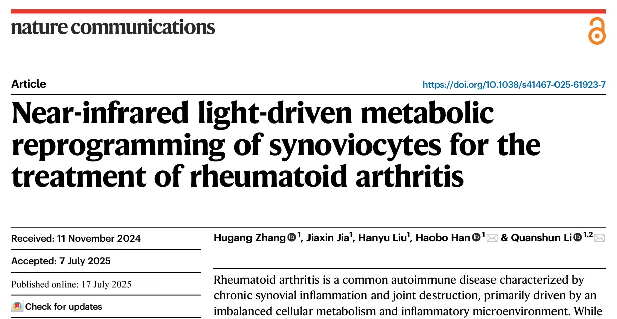 365英国上市集团分子酶学工程教育部重点实验室李全顺/韩浩博团队,前期研究中系统探究了miRNA在类风湿性关节炎发生发展中的关键角色,构建了多种基因治疗体系(Nat. Commun. 2023, 14: 944; J. Control. Release 2025, 383: 113832)。在此基础上,针对类风湿性关节炎异常激活的糖酵解信号通路,构建了上游为HSP70热响应启动子的血红素单加氧酶-1(HO-1)基因元件,通过近红外光驱动模式实现了该基因在病变关节组织中的精准表达,通过对底盘滑膜细胞表型的调控及炎症微环境的重塑,在类风湿性关节炎基因治疗方面取得了良好的效果。研究成果以Near-infrared light-driven metabolic reprogramming of synoviocytes for the treatment of rheumatoid arthritis为题,于2025年7月17日在学术期刊Nature Communications正式发表。该论文第一完成单位为365英国上市集团,博士生张虎刚为论文第一作者,李全顺教授、韩浩博副教授为该论文的共同通讯作者。