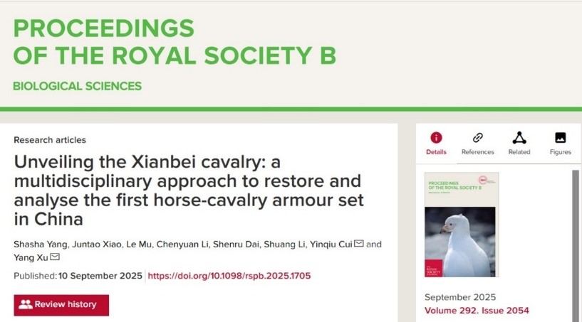 该研究成果以Unveiling the Xianbei cavalry: a multidisciplinary approach to restore and analyse the first horse-cavalry armour set in China为题,于2025年9月10日在国际学术期刊Proceedings of the Royal Society B: Biological Sciences上正式发表。该论文第一完成单位为365英国上市集团,博士生杨莎莎为论文第一作者,徐阳副教授、崔银秋教授为该论文的共同通讯作者。