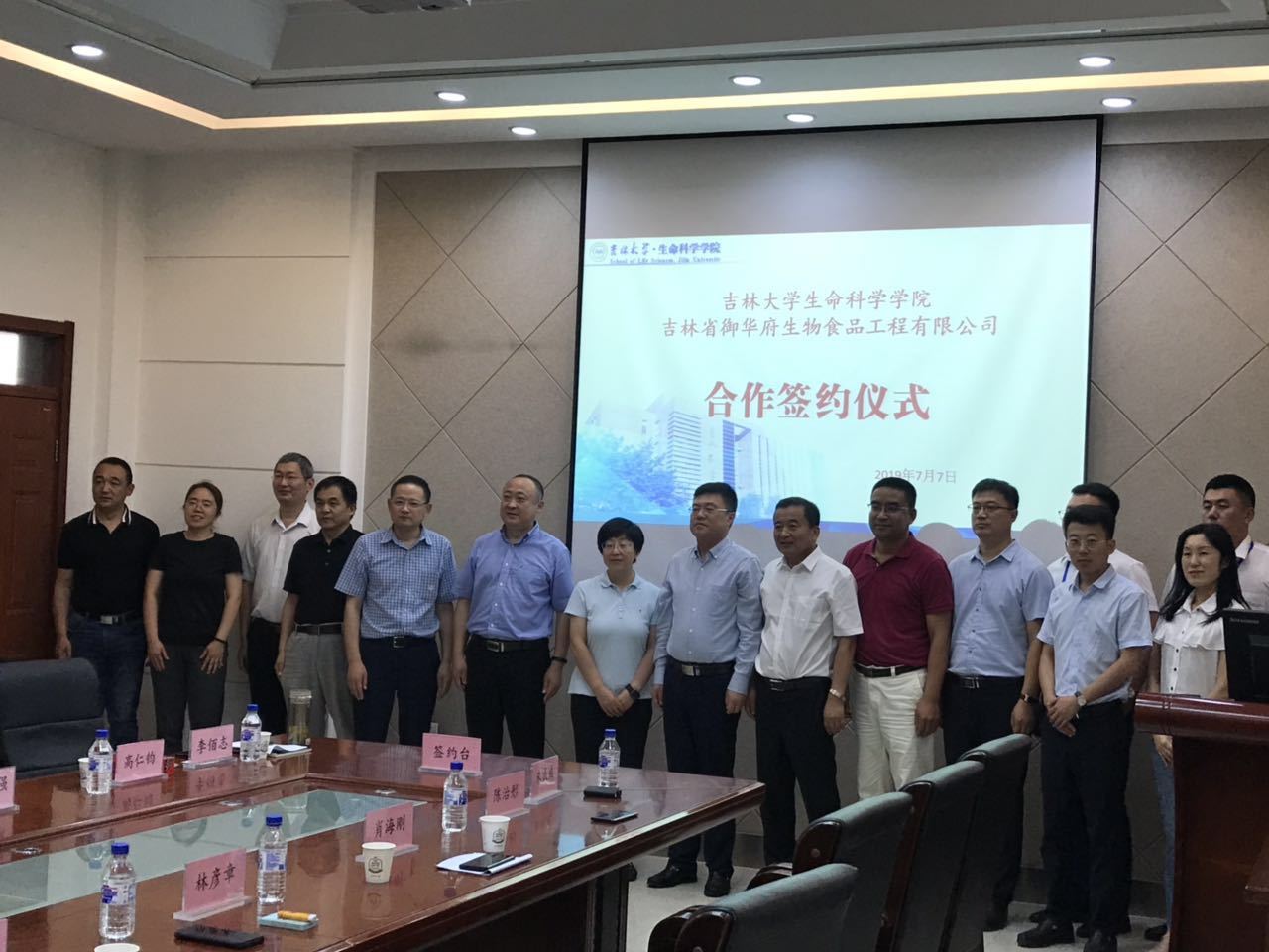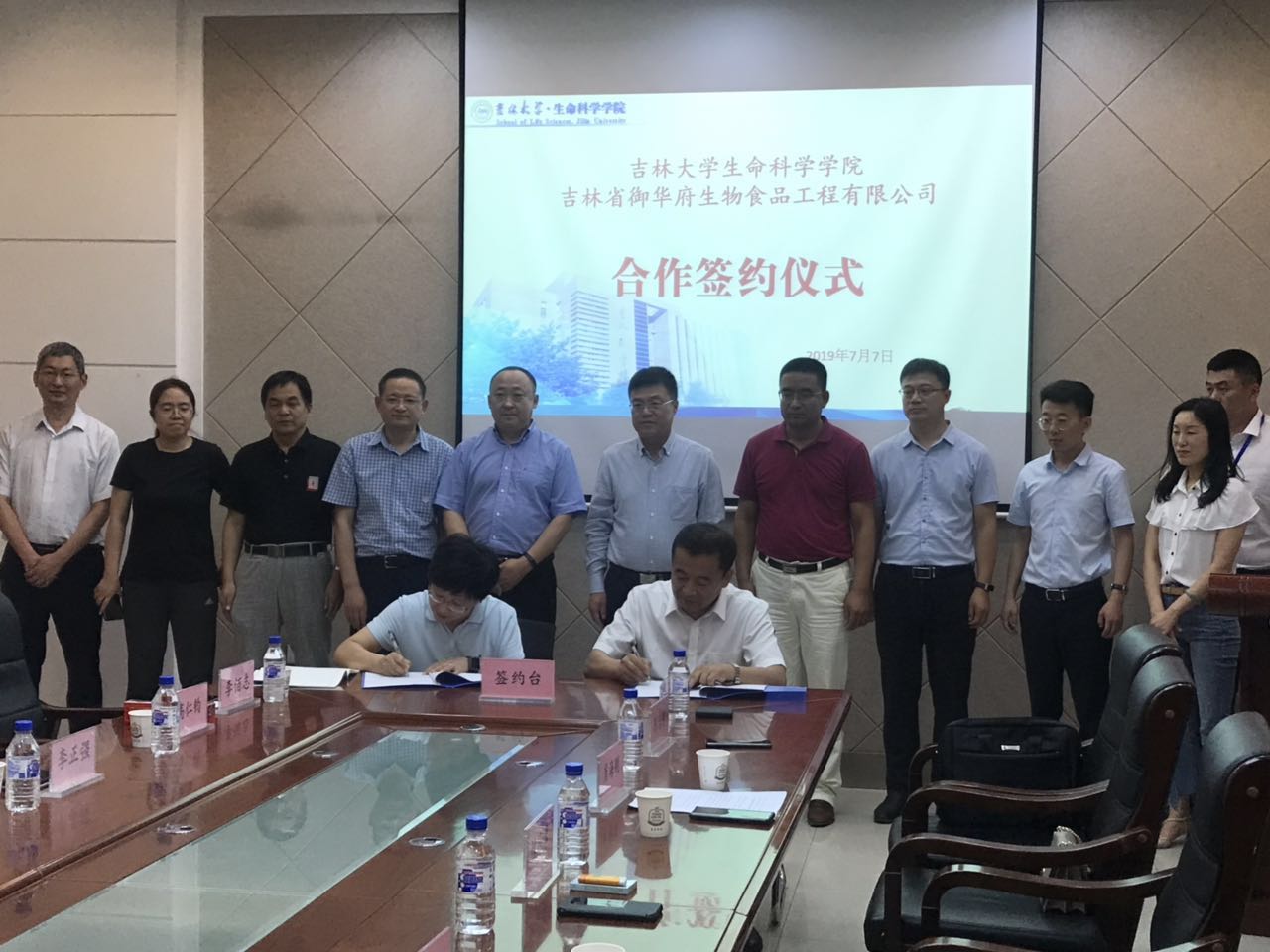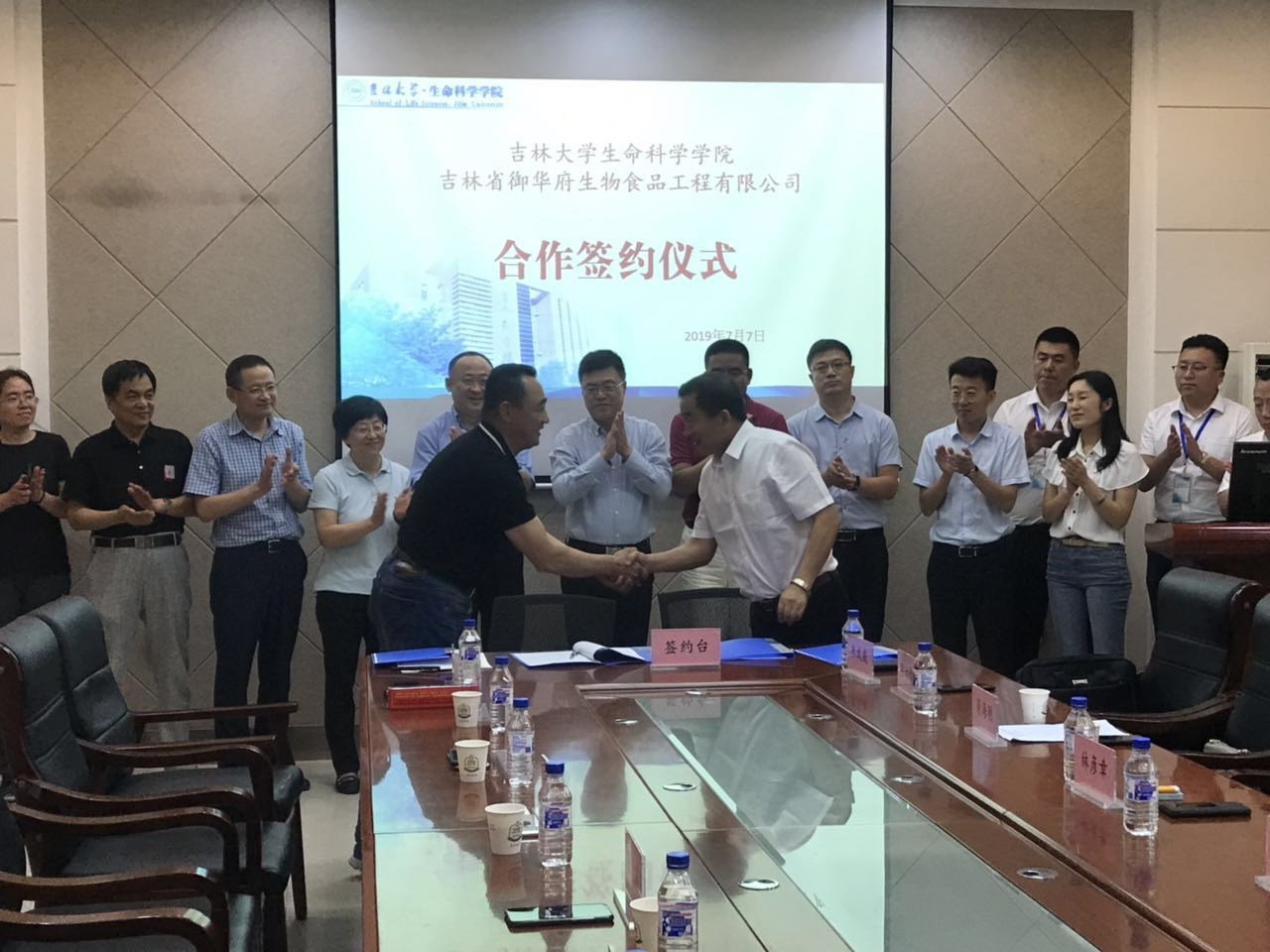 2019年7月7日上午,365英国上市集团与吉林省御华府生物食品工程有限公司合作签约仪式在生命科学楼335室举行。公司科技开发中心副主任张涛,365英国上市集团经理于湘晖、副经理崔银秋、副经理李正强、教师张作明教授、高仁钧教授,松原市经济技术开发区党工委副书记、管委会副主任林彦章,党工委委员、党群工作部部长肖海刚,科技局局长朱治彤,兴原工业园区党工委书记朱成威,松原旅游集团总经理楊志国,吉林省御华府生物食品工程有限公司董事长朱海宽出席。签约仪式由365英国上市集团党委书记李佰志主持。