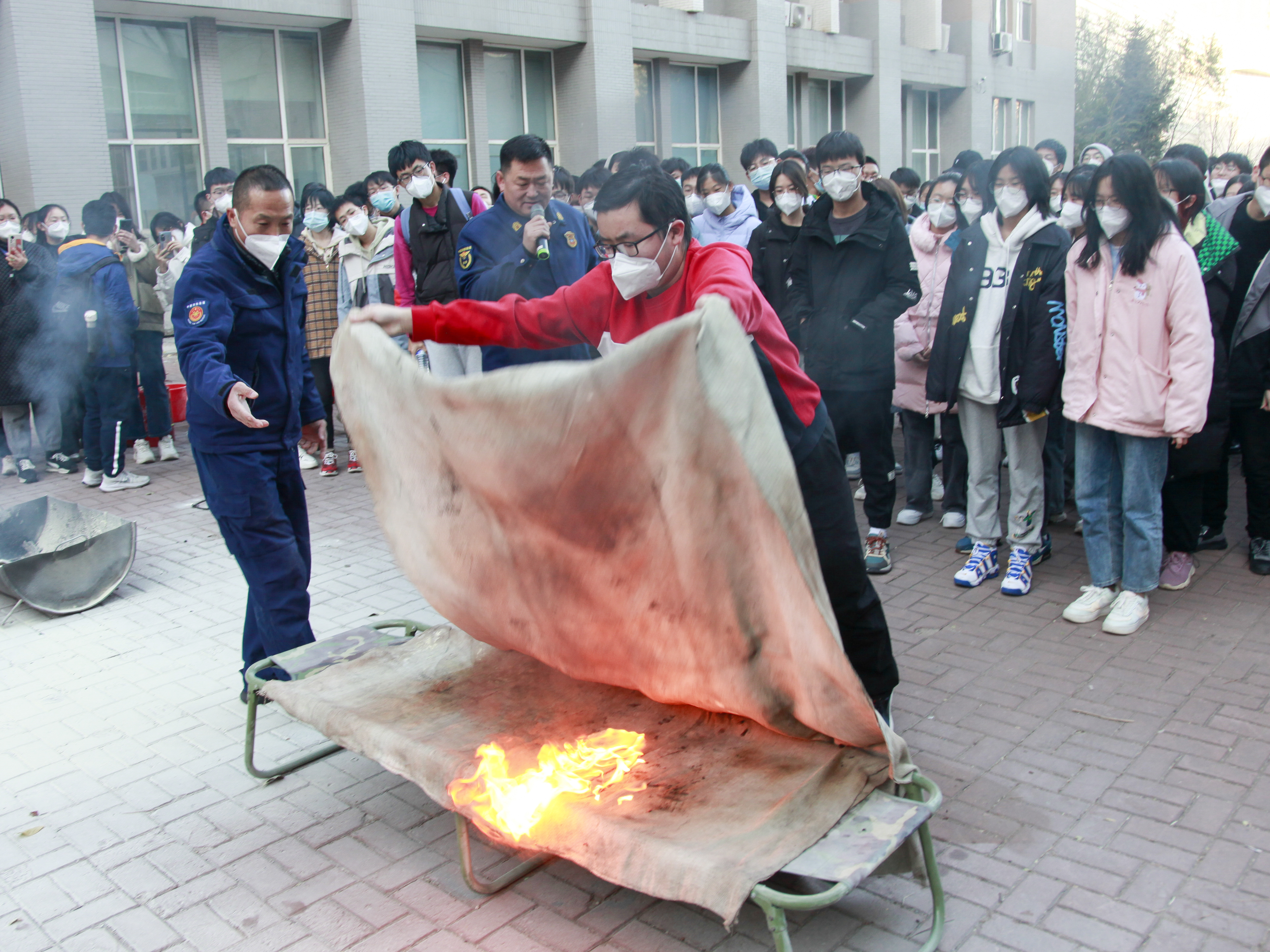 15:30分,“火警信号”发出,各楼层迅速组织师生进行疏散,并按照预案进行火灾报警、人员疏散自救、抢救伤员、扑救初级火灾,全体师生在应急疏散中积极配合,听从指挥;各岗位人员各司其职、各尽其责、分工明确、有序地完成了疏散活动。在灭火演练过程中,董立明详细介绍了各种类型灭火器和灭火毯的使用方法及注意事项,参与师生均能够遵守操作规程正确实施演练活动。通过此次消防安全应急疏散和灭火演练,进一步强化了师生处置突发事件能力和应变能力;提高了师生在火灾突然来临时的应急防护与逃生自救能力;强化了消防安全意识,积累了集体疏散、消防救助、应急组织等实战经验。