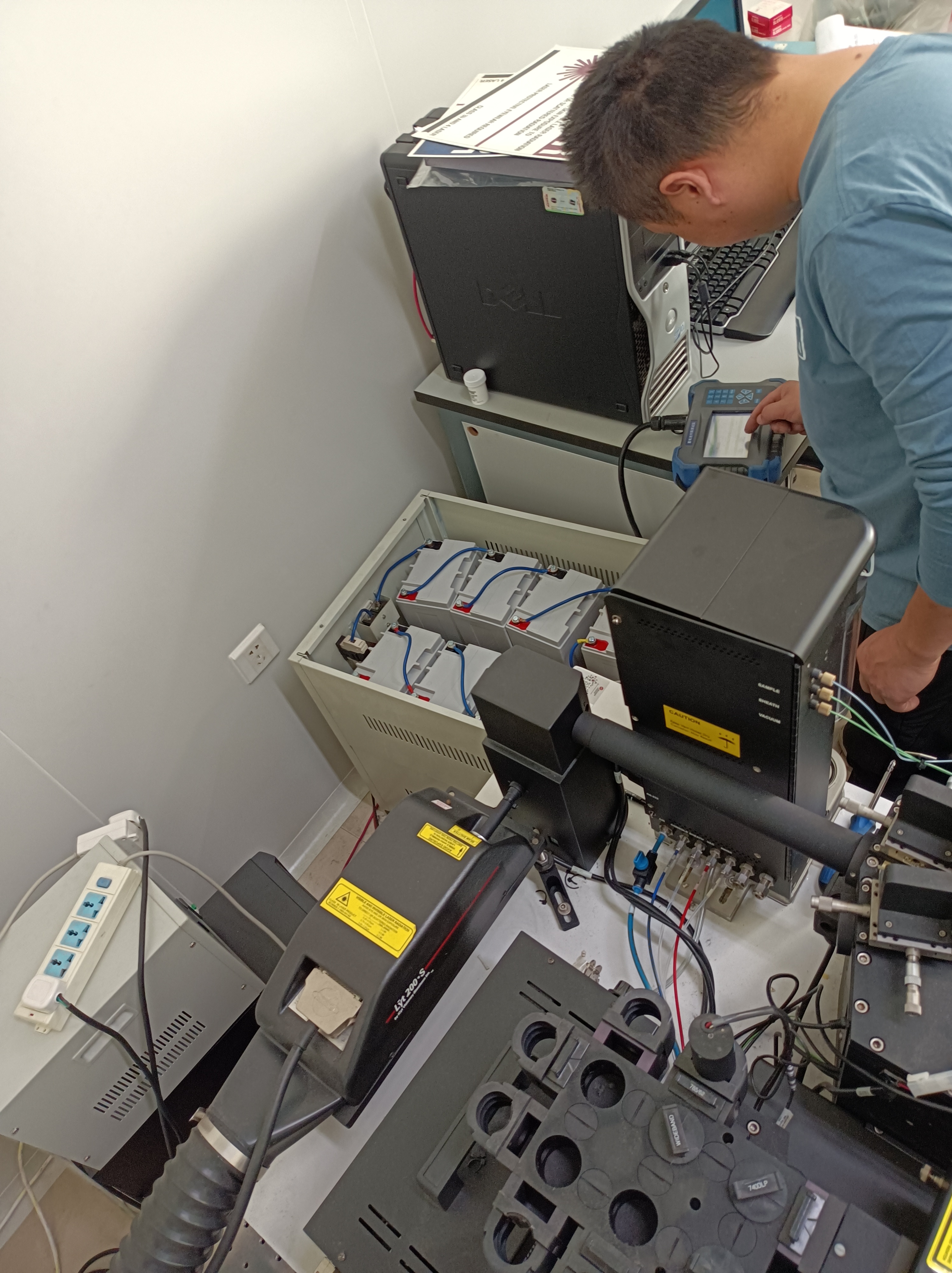 工程师正在检查主机情况,同时对电池进行内阻测试