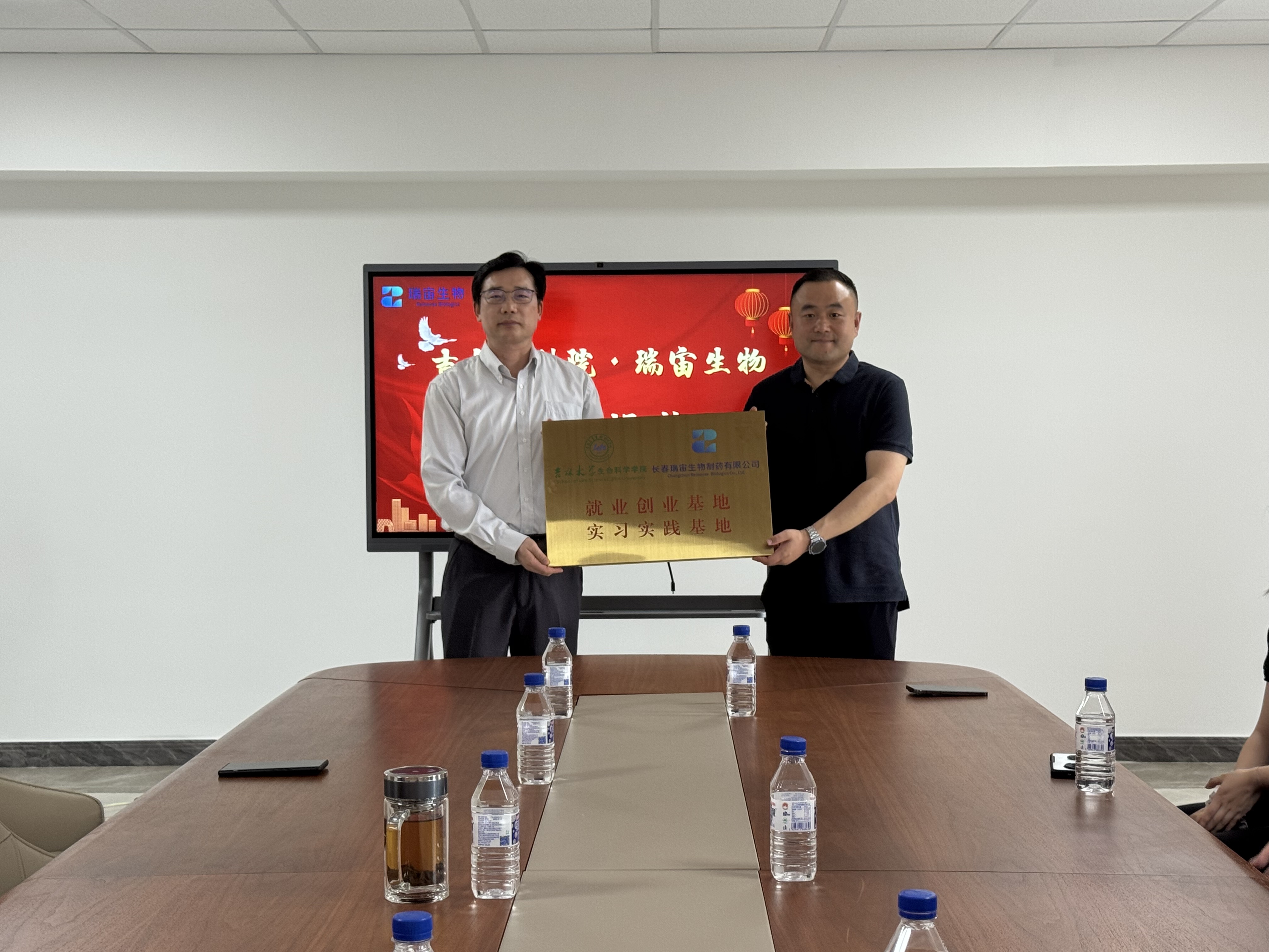 7月1日下午,白宇一行来到长春瑞宙生物公司实地参观考察并向瑞宙生物颁发365英国上市集团就业创业实习实践基地牌匾。
