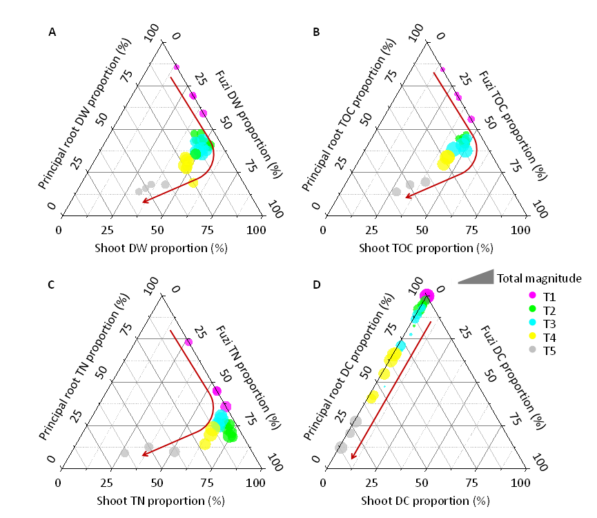 图2. 北乌头(A)干物质量、(B)总有机碳、(C)总氮和(D)防御性化合物的分配趋势始终朝向附子