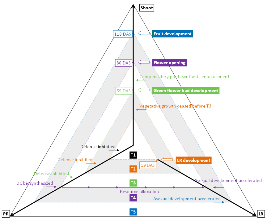 转录组测序和代谢物含量分析的结果进一步表明:CDPS和KS是防御性化合物合成的潜在关键基因。在花器官发育完成后,主根替附子合成了防御性化合物,并将资源和防御性化合物加速转运在附子,确保了植株可以同时加速无性发育和防御性化合物的积累。
