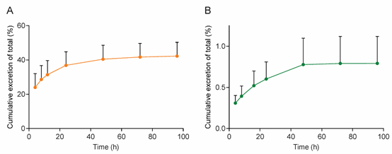 图5. PEG-PLA代谢物PEG在大鼠尿液(A)和胆汁(B)中的排泄曲线