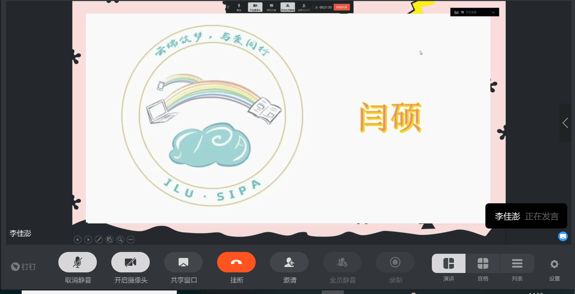而后闫硕同学为我们分享了她参加“云端筑梦师”志愿者线上志愿服务公益活动的故事。她细致地讲述了自己用各种形式为孩子们提供辅导的过程。她讲到对于自己能在这次公益活动中发光发热,在家防疫的同时,以自己的绵薄之力,点亮孩子们前进路上的灯感到非常荣幸。最后她表示希望许许多多的青年朋友一起,携手并进,做一些力所能及的事情,与党和国家同呼吸、共命运,用自己的坚持与付出,呵护孩子们通往星辰大海的漫漫征程。