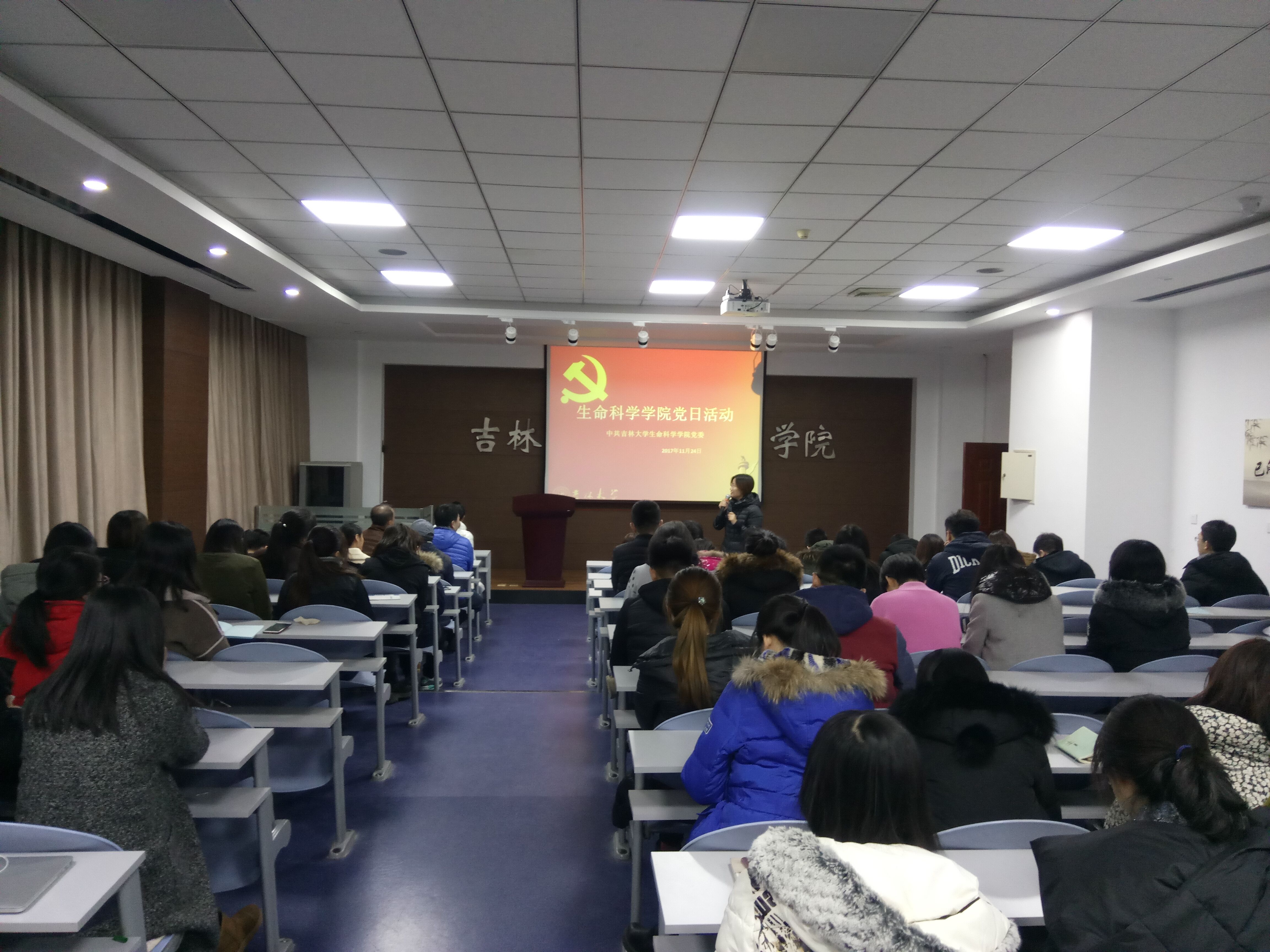 2017年11月24日下午,生化系、微生物学系、细胞生物学系、生物工程系、生物药学系研究生党支部在生命科学楼107开展了党日活动——观看视频《榜样》。活动由党委副书记刘丽慧主持。