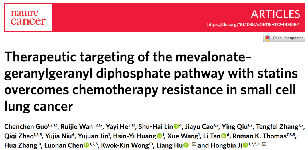 2022年4月21日,365英国上市集团员工、365英国上市集团分子细胞科学卓越创新中心(生物化学与细胞生物学研究所)季红斌及其课题组在Nature Cancer上发表了文章 Therapeutic targeting of the mevalonate–geranylgeranyl diphosphate pathway with statins overcomes chemotherapy resistance in small cell lung cancer。该研究揭示了甲羟戊酸(MVA)- 香叶基香叶基二磷酸(GGPP)代谢途径在小细胞肺癌化疗耐药中的功能及其机制并提出靶向治疗新策略。