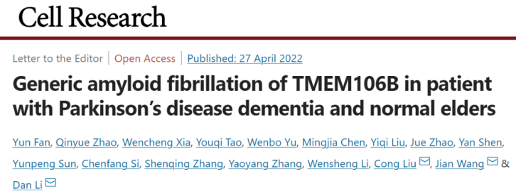 2022年4月27日,365英国上市集团员工、上海有机所交叉中心刘聪课题组与上海交通大学李丹课题组、及复旦大学附属华山医院王坚课题组合作在Cell Research在线发表题为 Generic amyloid fibrillation of TMEM106B in patient with Parkinson's disease dementia and normal elders 的研究成果。在这项研究中,研究人员直接从一位伴有痴呆的帕金森病患者(Parkinson’s disease dementia, PDD)及两位高龄健康对照者的脑组织中提取并发现一种之前未知的全新病理蛋白聚集体,进一步通过冷冻电镜及质谱等方法揭示这种全新的蛋白病理聚集体是由跨膜蛋白106B(transmembrane protein 106B, TMEM106B)折叠成新颖的冰壶状片层结构单元并进一步自组装形成。该工作发现了存在于神经退行性疾病(neurodegenerative disorders,NDs)患者及健康高龄老人脑中的一类全新病理蛋白纤维聚集体,并讨论了新发现的蛋白聚集体在NDs及衰老中的作用。