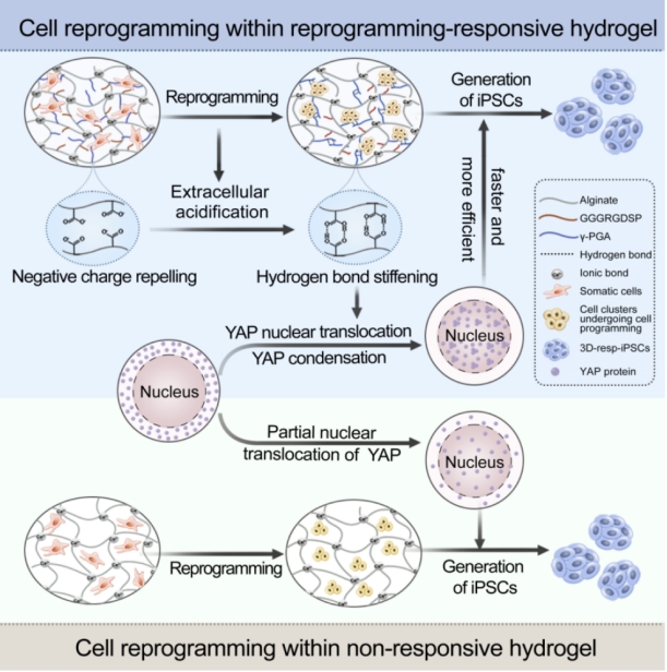 该研究通过合成生物学策略制备了细胞重编程响应水凝胶,能够真实地感知细胞重编程过程中的代谢重塑和胞外酸化,并通过改变其力学性能进行响应。在细胞重编程过程中,细胞重编程响应水凝胶机械特性的自主变化,在适当的时间诱导YAP蛋白相分离,确保了比传统细胞重编程方法更快、更有效地生成iPSC。