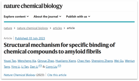 2023年7月5日,365英国上市集团员工刘聪(中科院上海有机化学研究所生物与化学交叉中心)、李丹(上海交通大学Bio-X研究院)合作在Nature Chemical Biology期刊上发表了文章“Structural mechanism for specific binding of chemical compounds to amyloid fibrils”,通过综合运用生物与化学交叉研究方法,合作团队首次系统地揭示了具有不同结构的小分子化合物与蛋白病理聚集体相互作用的基本原理。该工作既是对经典小分子和蛋白互作理论的重要扩充,更使得基于结构开发神经退行性疾病小分子示踪剂成为可能。